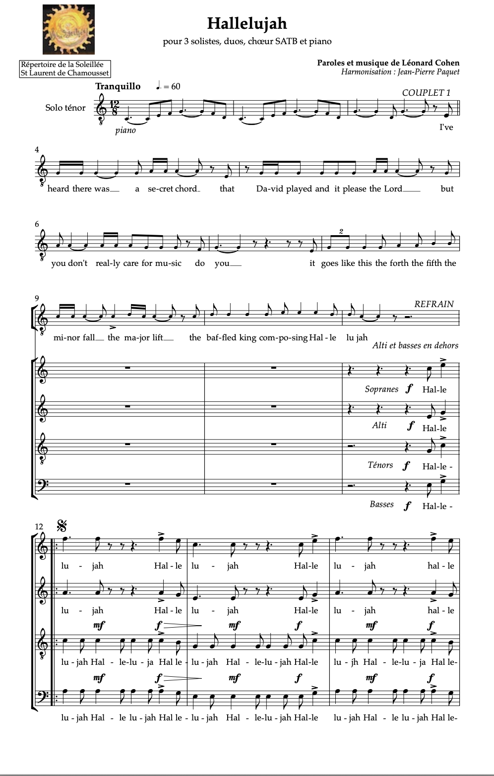 | Hallelujah | SSATTBB | oui | 12/8 | L. Cohen | Avec 3 solistes (soprane, ténor et baryton, duos) possibilité 1 soliste au choix et SATB |