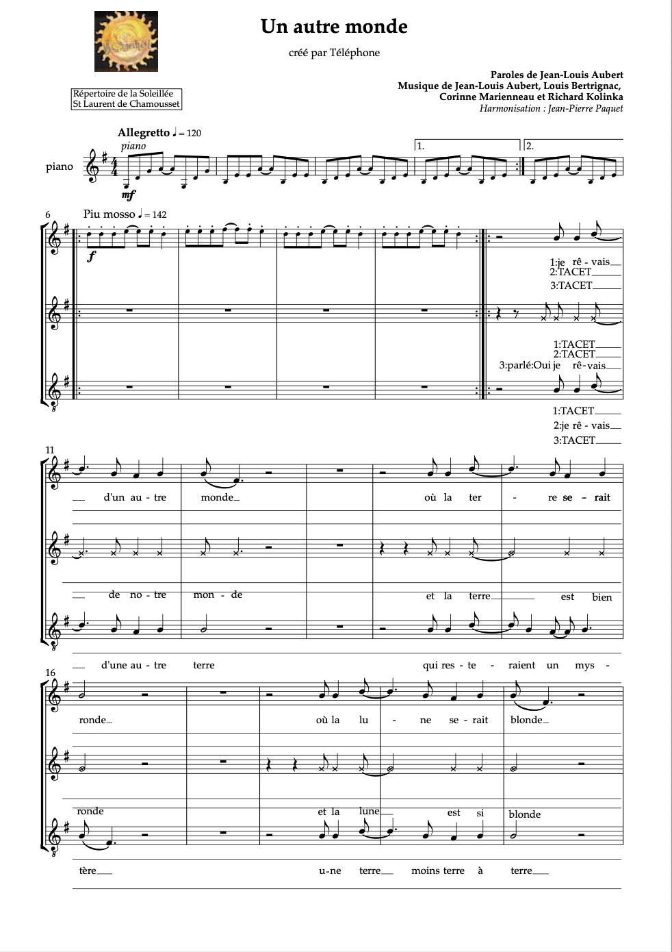 | Autre monde (un) Téléphone | SATB | oui | rock | Téléphone | avec rythmique et guit. électrique |